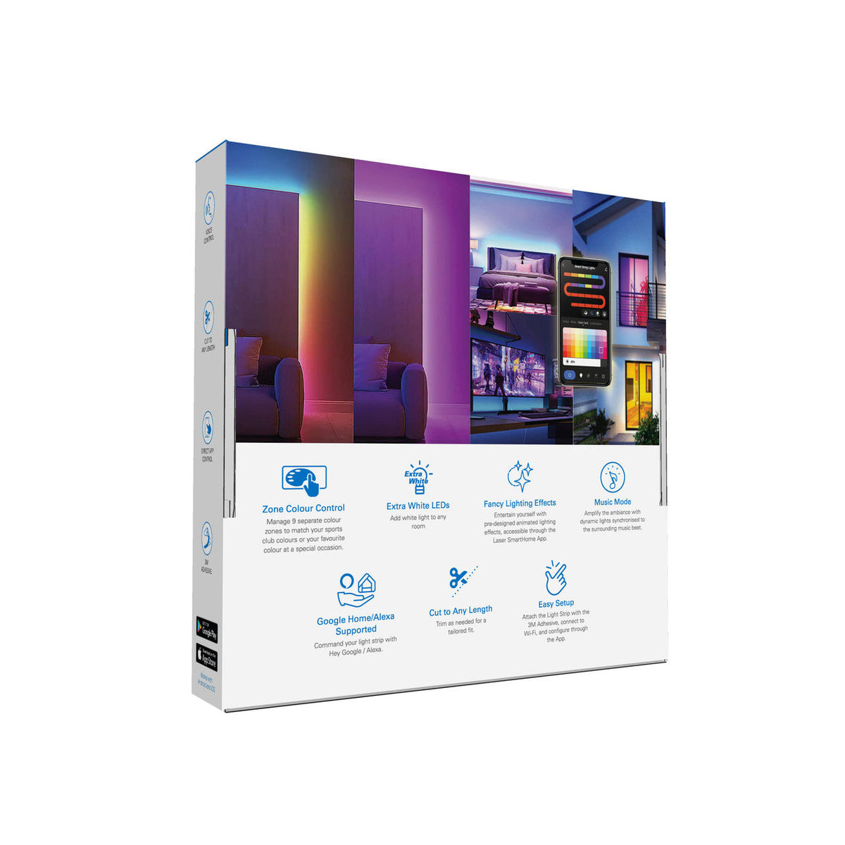 Voice-control with Alexa and Google Assistant: The Laser SmartHome LED Strip Light 3M lets you effortlessly turn on/off, adjust brightness, and pick colours. Compatible with Echo and Google Home, enjoy a truly hands-free smart living experience.